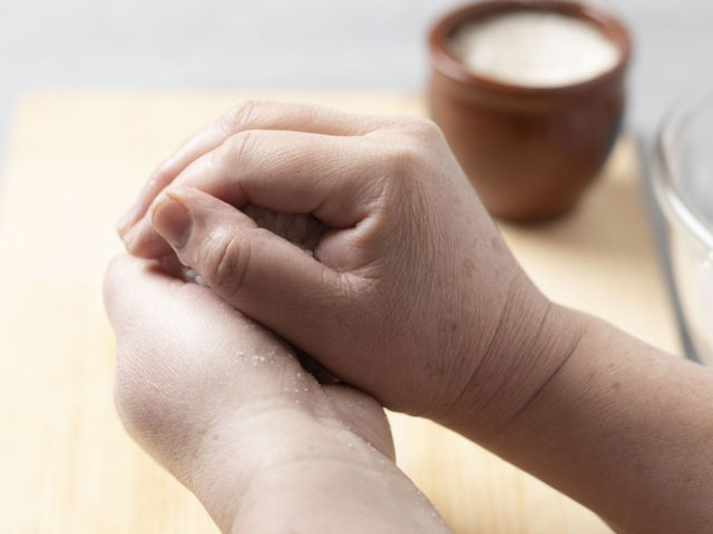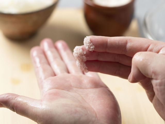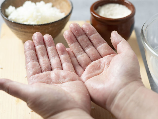 手のひら全体にに、塩をこすり広げる。
