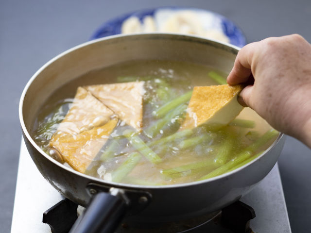 湯を沸かし、厚揚げを加える。フツフツしてきたら、ふきを加えてゆで、一緒に引き上げる。