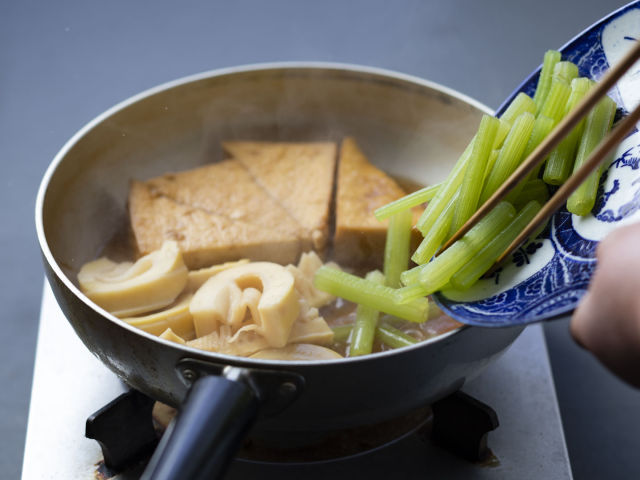 煮汁を火にかけ、フツフツしているところに、厚揚げを入れる。竹の子も加えて弱火で10分煮る。
