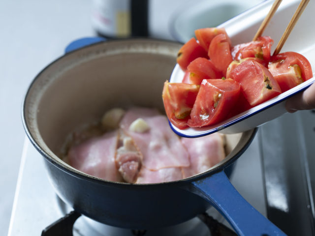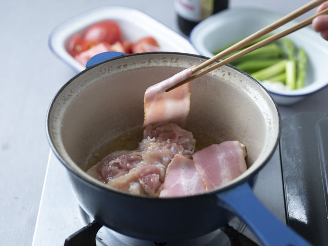 ・トマトは2cm角に切る。 ・アスパラは下のかたい所1cm程切り落とし、長さを3等分位に切る。いんげんならは2つ切る。 ・オクラはヘタのかたい部分を切り落とす。 ・にんにくは2つきりにする。 ・鶏肉は2つに切る。大きめの一口大でもいい。塩、胡椒をふる。 ベーコンは3つに切る。