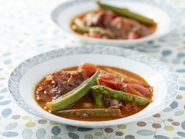トマト、アスパラ(いんげん)、オクラの順に加える。 Aの材料を次々入れ、弱めの中火で20分ほど煮る。フタはしてもしなくても。