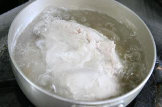 鶏肉は塩を全体にふり、1.5カップ程の湯で、中に火が通るまで、蓋をして茹でる。
