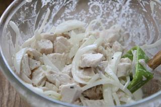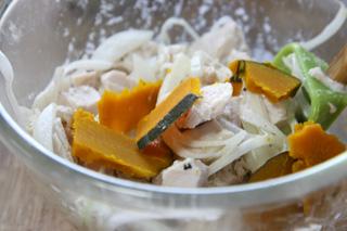 ④にマヨネーズ、生クリーム、塩、胡椒を入れてさっと混ぜ、鶏肉を混ぜる。