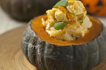 スプーンで種とワタを取り除く。 かぼちゃの実は少し削って(かぼちゃの器に穴があかないように)⑥に混ぜる。