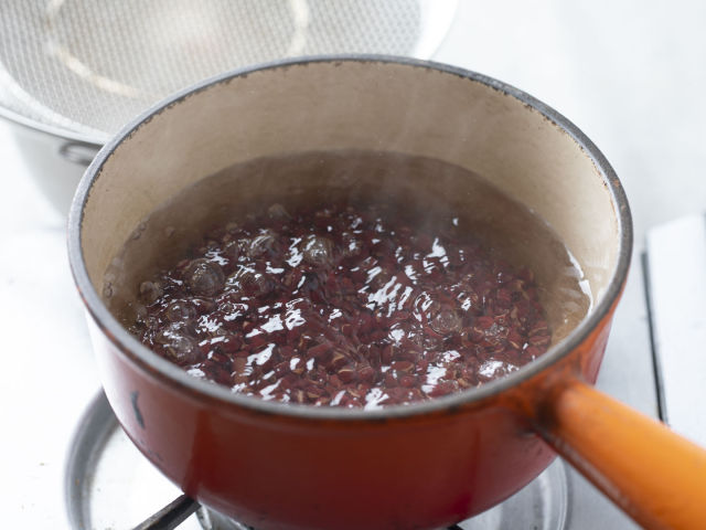 小豆を鍋に入れ、4〜5倍の水(分量外)を加えて火にかける。 沸騰したらザルにあけて水けを切る(ゆでこぼす)。これを2回ほど繰り返す。