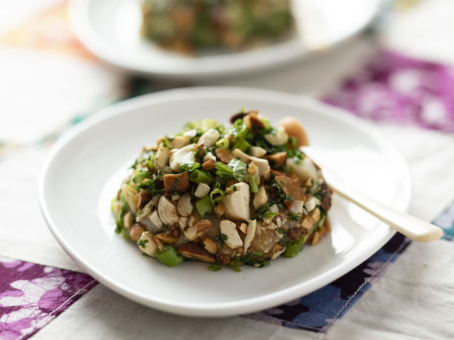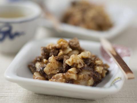 懐かしの甘辛醤油で下味を絡め、ナッツをたっぷりまぶしつける。