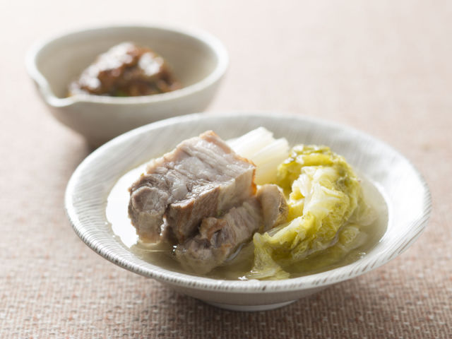 白菜も豚肉もどかーんと大らかに煮ます。山椒をピリリときかせ、葱もたっぷり加えた自家製味噌だれで召し上がれ。