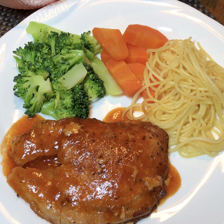 肉を焼いた後にソースを入れる時軽く肉から出た油を拭き取りました。ウチで人気のメニューです。