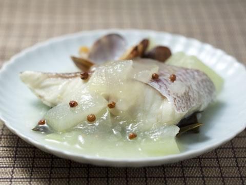 白身魚は水分代謝をよくし、良質なたんぱく質やビタミンが豊富。冬瓜は余分な水分を排出するほか、体の熱・ほてりをとり、喉の渇きを癒します。お腹を温める花椒を加えると、除湿効果がさらに高まり、冬瓜の涼性を緩和します。夏バテ解消にも最適、見た目にも涼しげなひと皿です。