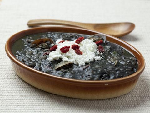 黒の正体は黒ごま。ごまは小さな粒の中に、良質なたんぱく質、ビタミンE、食物繊維、カルシウム、鉄分など、体に必要な成分がギュッと凝縮されています。薬膳では、白ごまは肺に、黒胡麻は肝や腎への作用があるとされ、髪のトラブルには、髪をつかさどる腎に働きかける黒ごまを摂ることをすすめます。血液を補い、肌荒れ予防によいほうれん草、カルシウム豊富なチーズを使った、老化防止・美髪効果の期待できるリゾットです。